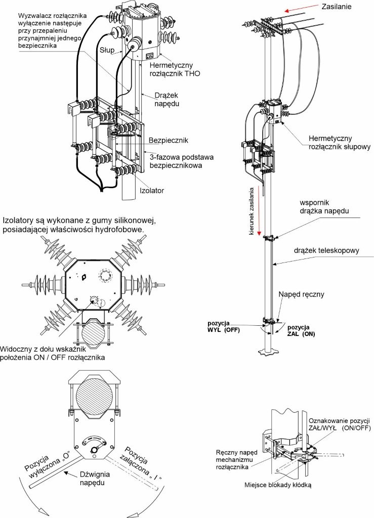 Rozłącznik THO jest urządzeniem SN, przeznaczonym do instalacji na liniach napowietrznych SN. Składa się z napędu i części czynnej, izolowanej suchym powietrzem, umieszczonej wewnątrz obudowy ze stali nierdzewnej, która gwarantuje szczelność przez ponad 30 lat.