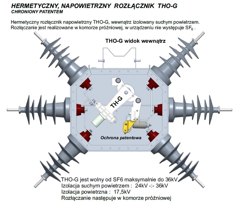 THO to rozłącznik dedykowany do stosowania na liniach napowietrznych (do 24kV lub do 36kV). Hermetyczna, odporna na korozję obudowa jest wykonana ze stali malowanej lub stali nierdzewnej. Wszystkie elektrycznie aktywne części są instalowane wewnątrz hermetycznej obudowy i są chronione przed szkodliwymi oddziaływaniami otoczenia, środowiska naturalnego.